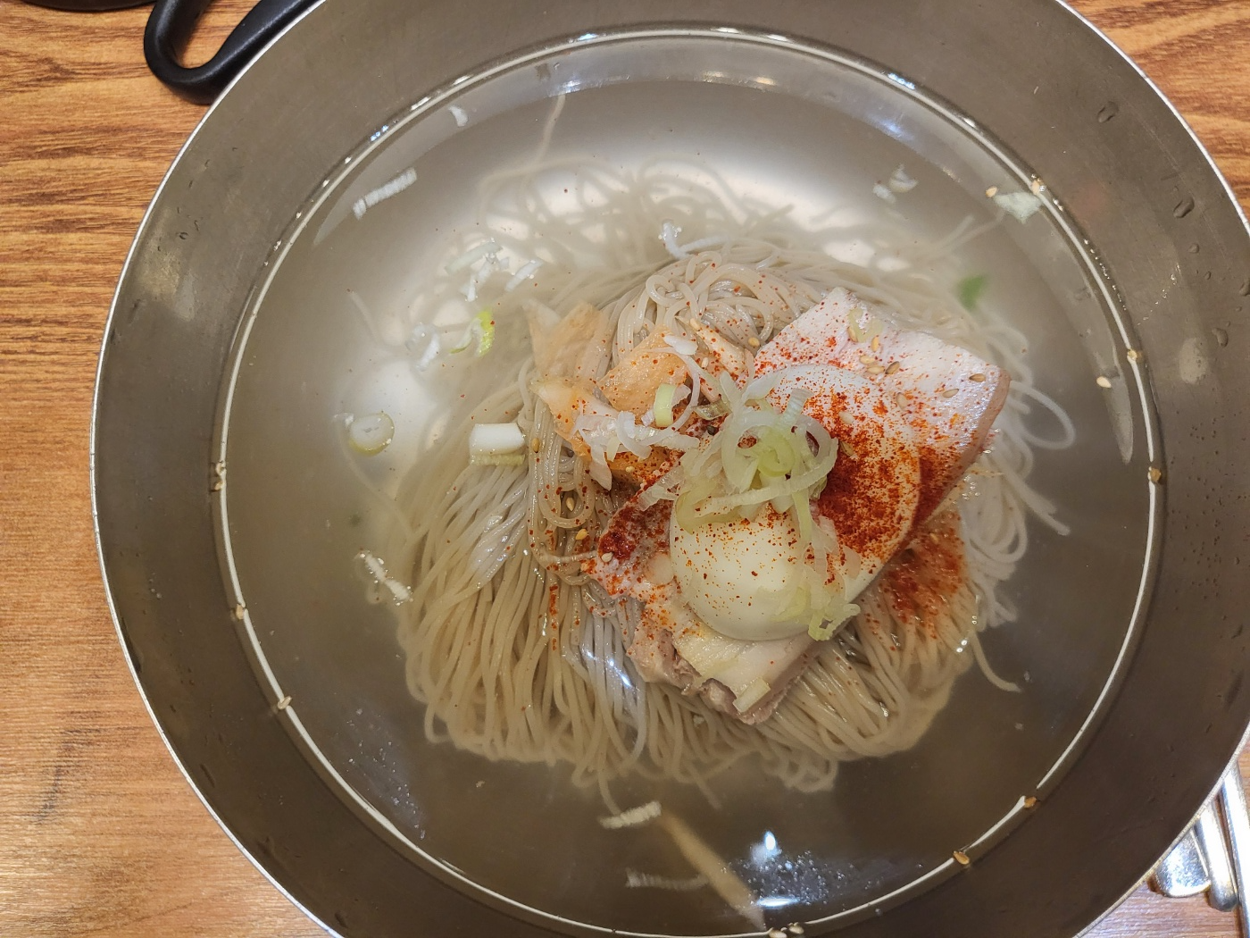 자리에 앉고 주문한 지 얼마 지나지 않아 드디어 평양냉면이 나왔어! 첫눈에 봐도 정말 정갈하고 깔끔한 비주얼이었지.