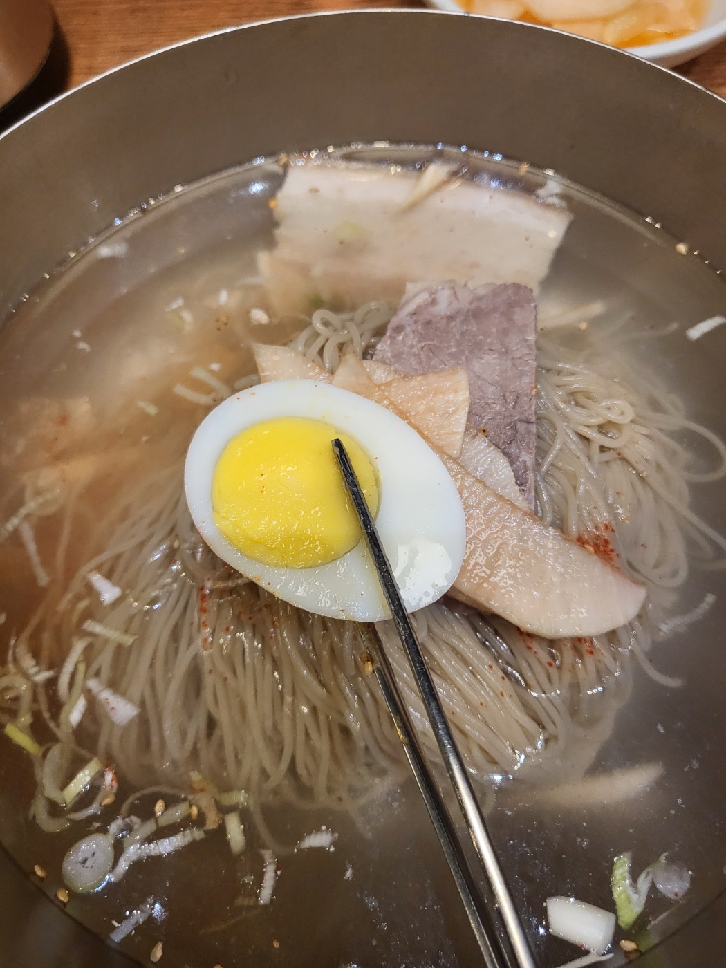 삶은 달걀: 반숙 상태의 달걀이 면과 함께 먹으니 고소함이 배가됐지 편육: 부드럽고 담백한 소고기 편육이 씹는 맛을 더해줬어 무: 아삭한 식감의 무 채가 냉면의 시원함을 더욱 살려줬고 각각의 고명들이 따로 놀지 않고 하나의 완성된 요리로 어우러지는 느낌이었어~